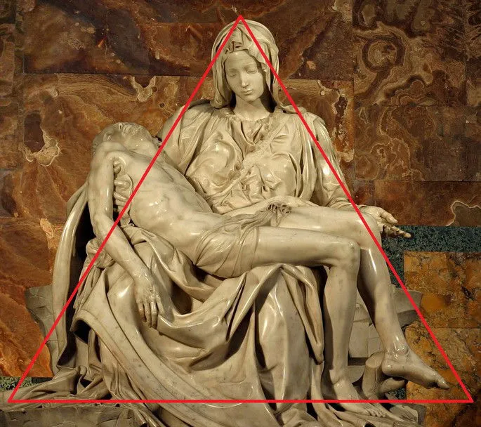 이 피에타는 완벽한 피라미드 구도이고, 그리스도는 고대 그리스 신상神像에서 볼 수 있는 멋진 육체를 가지고 있으며, 성모는 앳돼 보이는 얼굴에 고요한 표정을 짓고 있다. 슬픔과 고뇌보다는 고상한 젊은 남녀의 아름다움을 형상화한 것처럼 보인다. 미켈란젤로는 성모자의 아름다움은 육체적인 게 아니고 순결과 성스러움에서 오는 영적인 아름다움이라고 해명했다.