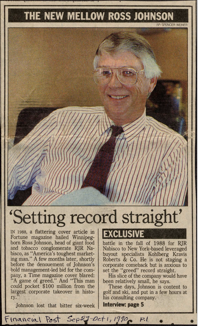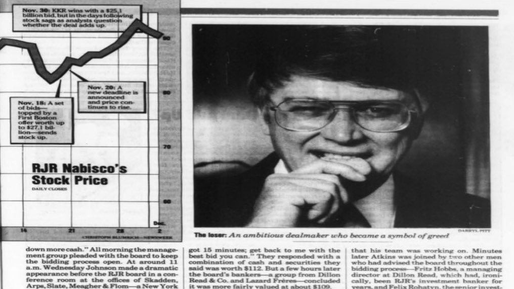 존슨을 때리는 신문 기사들이 줄지어 나왔다. "5250만 달러의 ‘황금 낙하산’, 우호적인 RJR 중역들에게 나누어 준 5000만 달러 가치의 ‘양도제한조건부주식’ 52만 6000주, 존슨 자신은 어떤 경우에도 결코 손해 보지 않도록 설정한 상황 등"이 그런 내용들이었다. 설상가상으로 언론은, 이사 각각이 모두 1500주씩 받은 양도제한조건부주식과, 컨설팅 계약을 통해 이사들이 받기로 되어 있는 두둑한 컨설팅 수수료 등 존슨이 이사회에 부여한 온갖 혜택까지 포착했다.