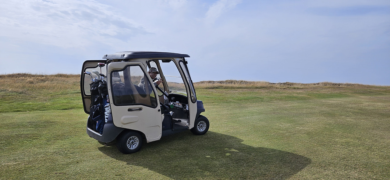 그나마 다행히 스타트하우스에서 양쪽 문이 있는 소형전기차 같은 버기를 발견하고 그전에 3일 내내 세인트앤드루스에서 트롤리를 끌고 다니며 라운딩을 하느라 너무 힘든 상황이라 냉큼 버기를 빌려 라운딩 내내 타고 다니면서 너무 행복했다^^ 그런데 그날 라운딩 내내 버기를 탄 플레이어들은 우리 밖에는 보지 못했다.