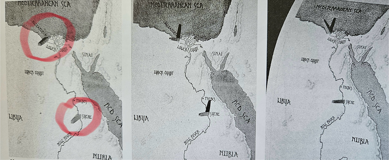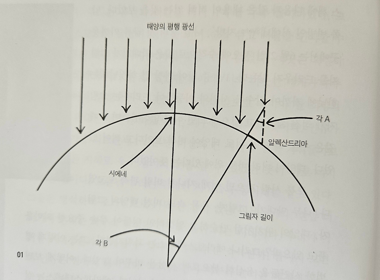 그는 파피루스 책에서 ‘남쪽 변방인 시에네(Syene, 현 이집트의 아스완) 지방에서는 6월 21일 정오에 수직으로 꽂은 막대기가 그림자를 드리우지 않는다. 그때 깊은 우물 속 수면 위로 태양이 비춰 보인다’(태양이 머리 바로 위에 있다는 뜻이었다)고 씌어 있는 것을 읽는다.
