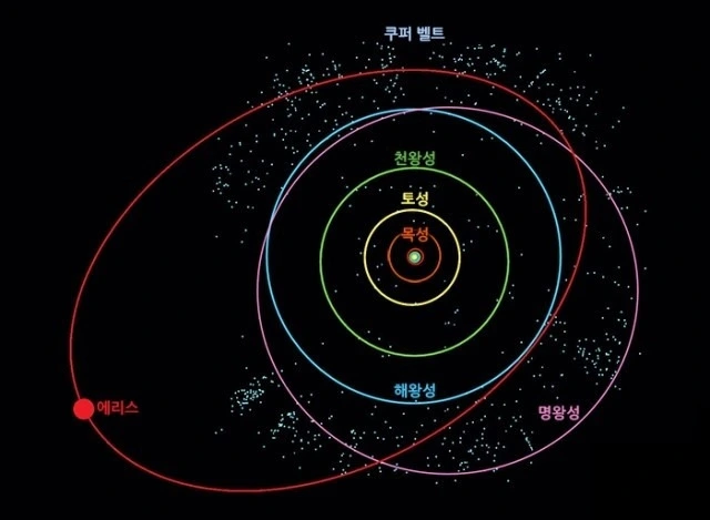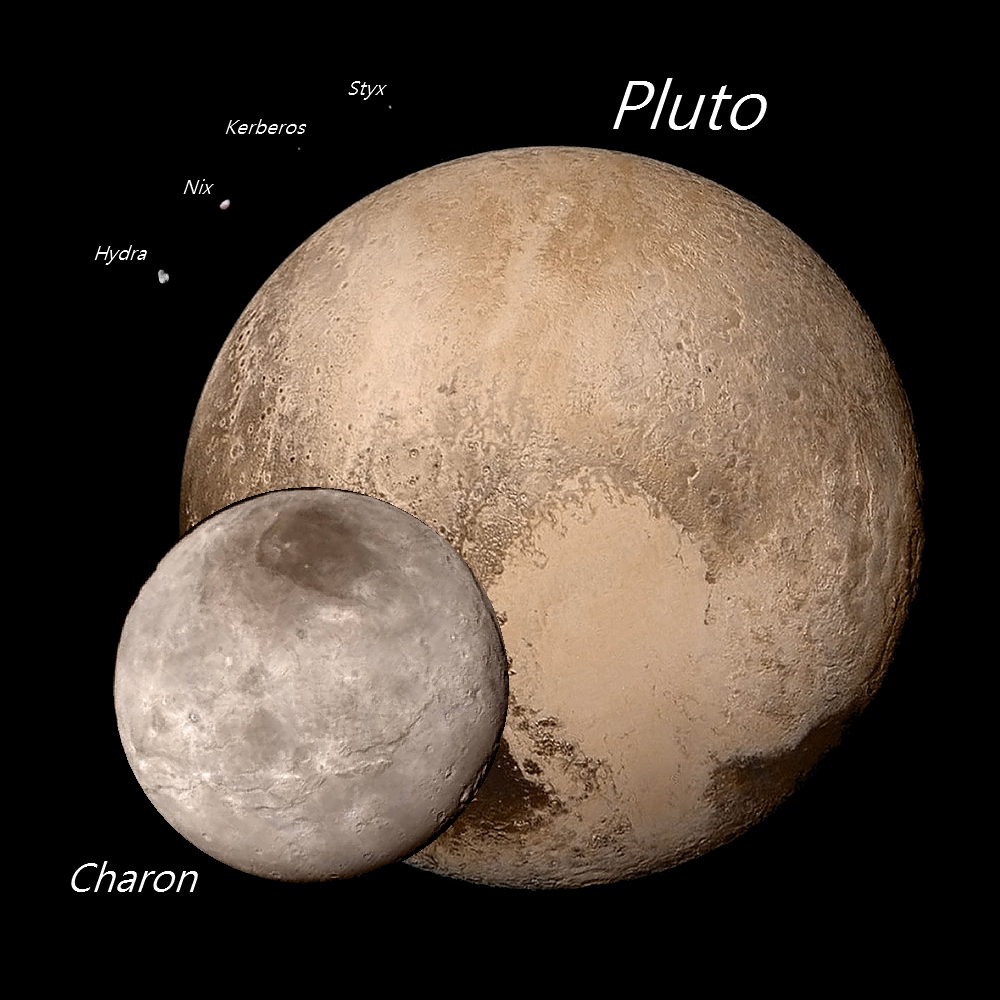 명왕성(Pluto)은 메탄 얼음으로 덮여 있는 행성으로 '카론'이라는 대형 위성을 하나 거느리고 있다(*2006년 8월 24일, 국제천문연맹은 새로 발견된 '에리스' 행성과 더불어 명왕성이 태양 주위를 돌고 구형인 천체지만 공전 구역 안에서 지배적인 역할을 하지 못한다(지나친 타원형)는 이유로 명왕성을 태양계에서 제외하고 왜행성(Dwarf Planet) 으로 분류하였다).