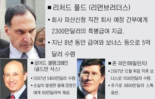 한 가지 분명한 차이점은 좋았던 시절에 받았던 보너스는 회사의 수익에서 나온 반면, 구제 금융 보너스는 납세자들로부터 왔다는 사실이다. 그들의 보너스가 납세자로부터 나온 이유는 그 기업이 실패했기 때문이다. 미국인들은 탐욕보다 실패에 더 엄격하다.