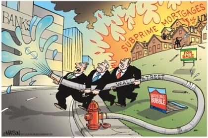 2008년 10월 주택 가격의 거품이 꺼지면서 월스트리트의 은행 및 금융 기관들은 주택 담보 대출에 기반한 복잡한 투자를 해 왔기 때문에 벼랑 끝에 내몰렸다. 그로 인해 일반 미국인들까지 은퇴 자금 대부분을 날리는 등 큰 피해를 입었다.
