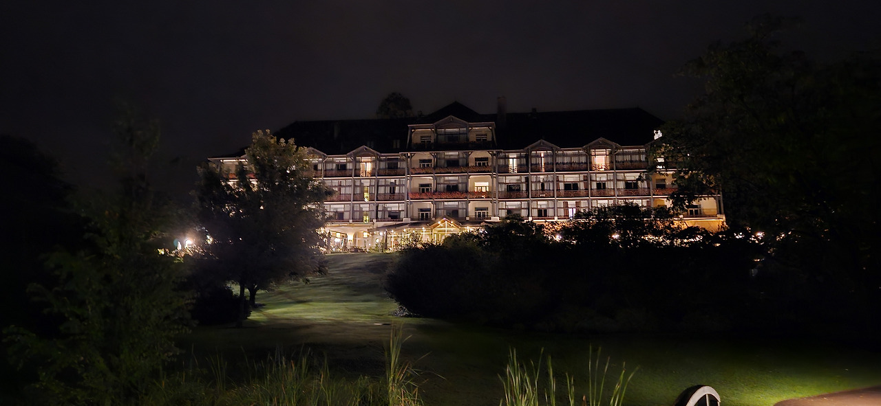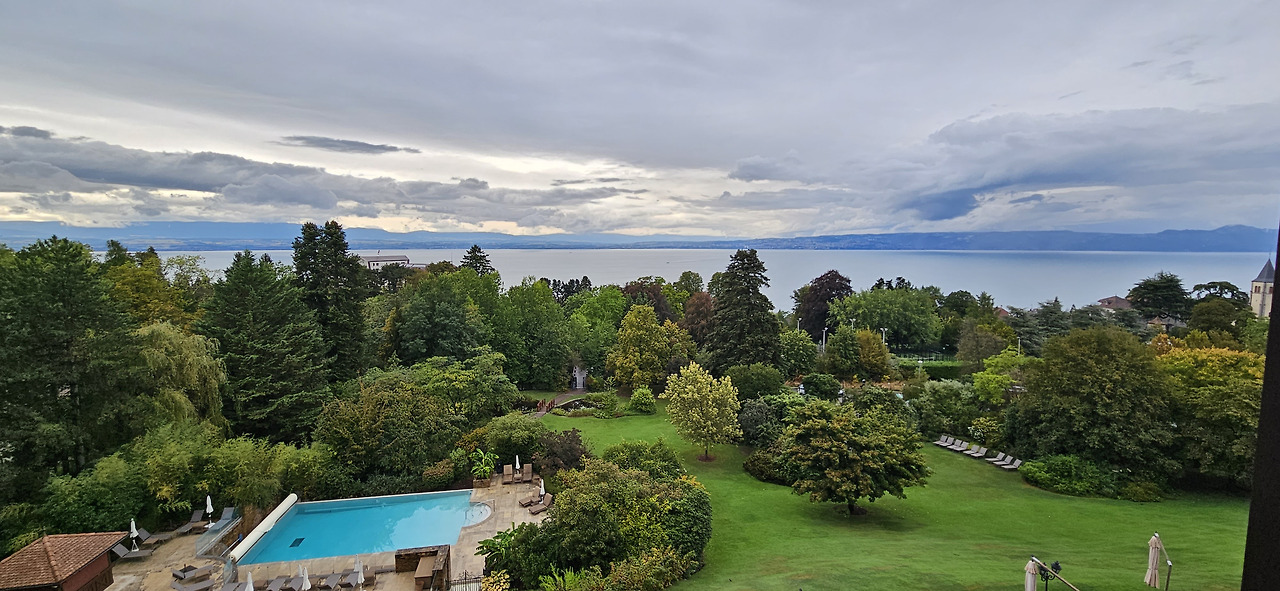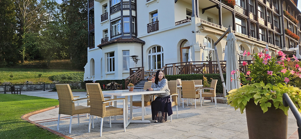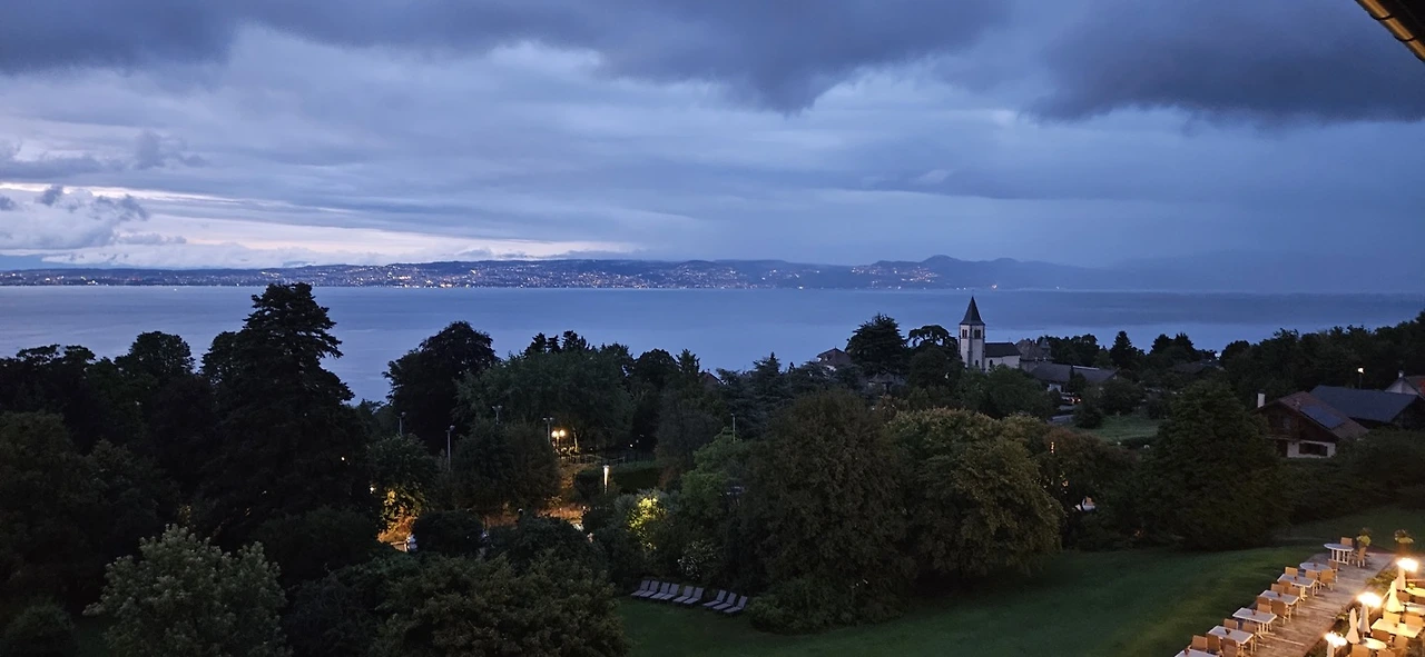 첫날 에르미타쥬 호텔에서 바라본 호텔 내 리조트 시설과 레만호 주변 풍경은 너무나 아름다웠는데 저녁이 되니 리조트 내 교회의 종소리와 함께 더욱 평온하고 환상적인 풍경이 펼쳐졌다.