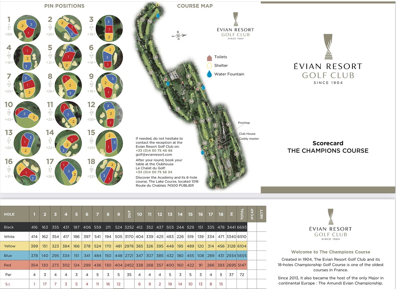 전장은 홈페이지와 스코어카드에는 화이트티 기준으로 파72, 6,510야드로 소개되어 있는데 아문디에비앙 챔피언쉽에서는 보통 파71, 6,470야드 정도로 세팅되는 것 같다.