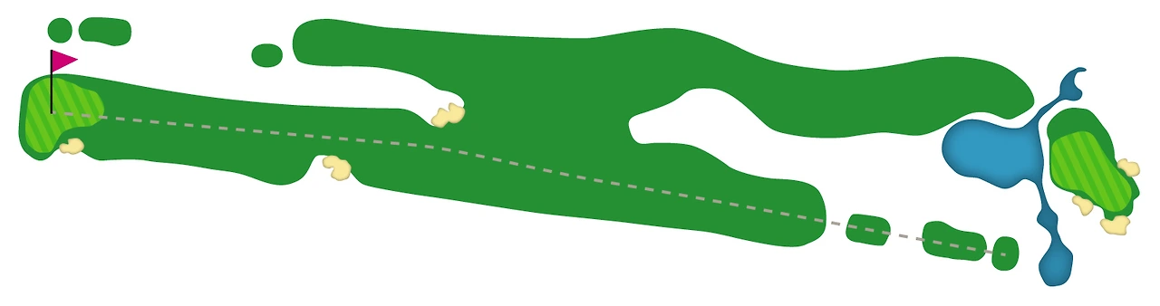“A par 3 with a green guarded by water to the front and right. You must make sure you use a club with enough distance to get past the water hazard and aim for the left side of the green.“