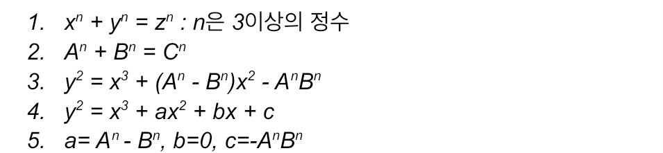 먼저 프라이는 <페르마의 마지막 정리>가 사실이 아니고 페르마의 방정식(1번 식)을 만족하는 정수해 (x, y, z)가 존재한다고 전제하면서 이를 A, B, C로 표현하였다(2번 식).