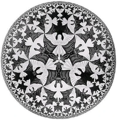 아래 그림은 하이퍼볼릭 공간을 2차원 평면에 표시한 것으로 고도의 대칭성을 시각적으로 보여주고 있는데, 그림의 가장자리로 갈수록 형태가 왜곡되면서 대부분의 대칭적 성질들은 시야에서 사라져 버리게 됨을 보여준다.