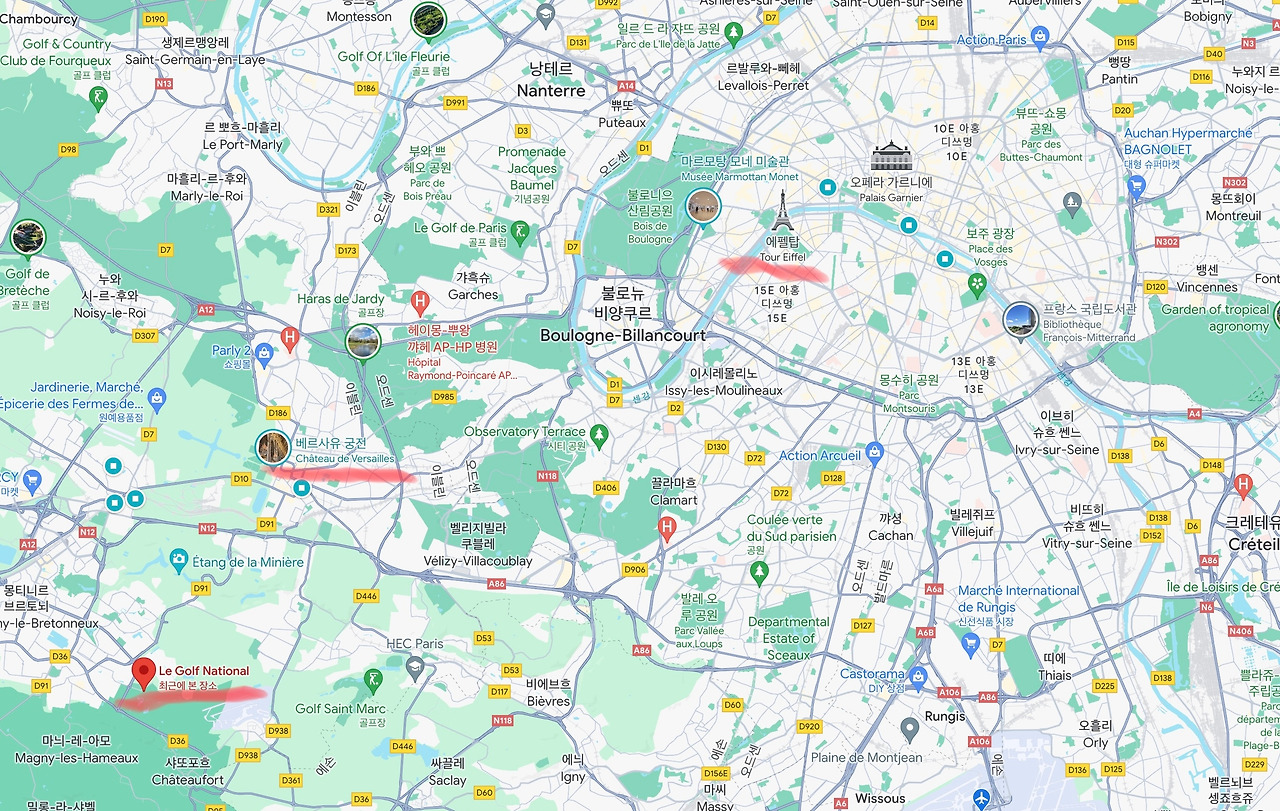 르 골프 나쇼날 골프장은 파리 중심부에서 서남쪽으로 1시간 정도 떨어져 있는 곳이다(2 Av. du Golf, 78280 Guyancourt, France).