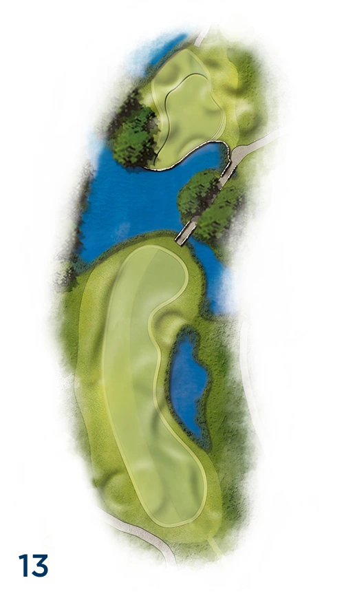 13번 홀도 상당히 특이한 홀인데, 전장 자체는 화이트티 기준 351미터라서 아주 길다고 할 수는 없는데 그린이 호수를 건너 위치해 있고 양쪽으로 큰 나무들이 막혀 있어 세컨드샷이 핀을 향해 거리, 방향을 모두 정확하게 쳐야 하는 상당히 부담스러운 홀이다. 그래서 핸디캡 3번인 것 같았다.