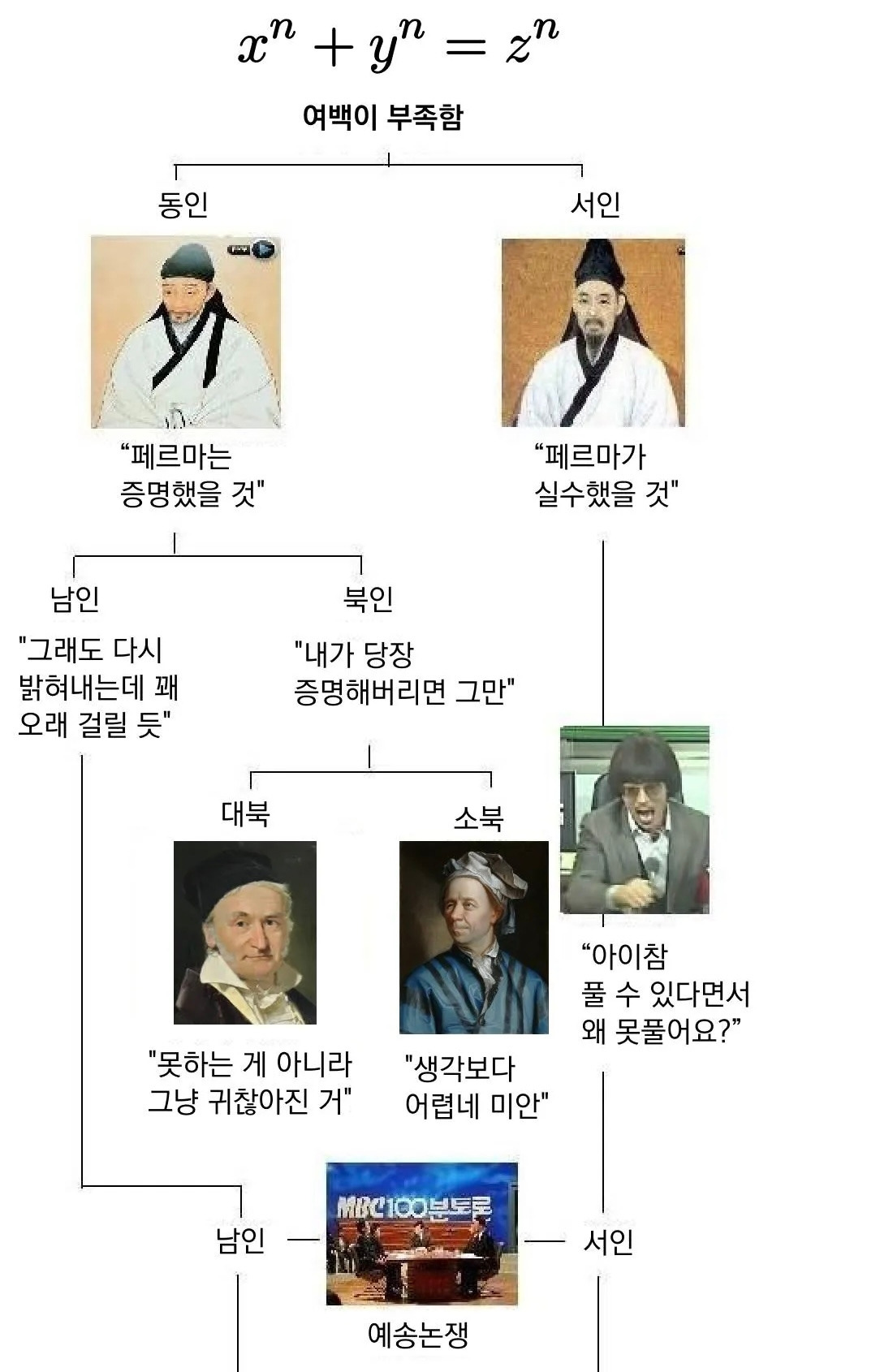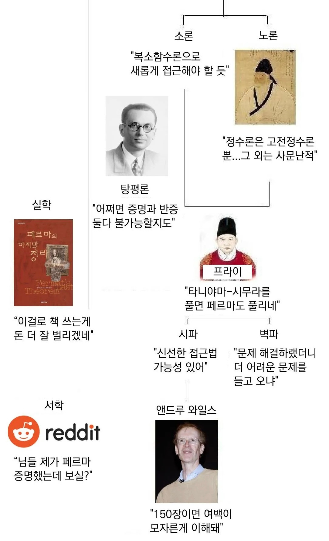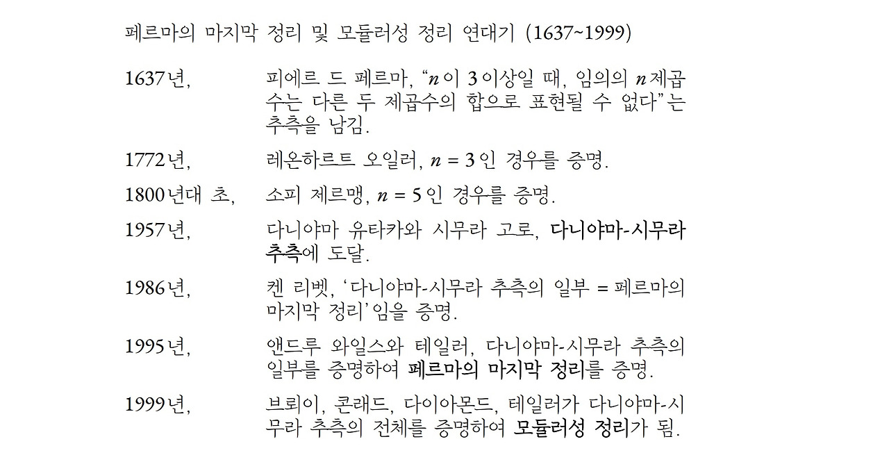 이렇게 페르마부터 시작해서 오일러, 소피 제르맹, 디리클레, 르장드르, 라메, 다니야마, 시무라, 프라이, 켄 리벳, 콜리바긴, 플라흐, 이와사와 등 수 많은 수학자들을 거치면서 결국 마지막으로 앤드류 와일즈에 의해 모든 이론들이 종합되어 <페르마의 마지막 정리>가 참인 것으로 드디어 증명되었다.