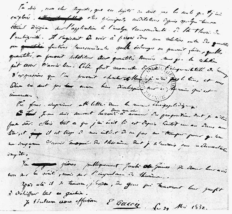 작년 3월 1일 이전에 갈루아는 대수 방정식의 풀이에 관한 논문을 심사위원회에 제출했다. 그의 논문은 두 개의 논문을 하나로 축약한 것이었는데, 누가 보아도 최종 심사에 오를 만한 매우 훌륭한 논문이었다. 갈루아는 라그랑주조차 해결하지 못한 부분을 완벽하게 풀어냈으므로 대상을 받는 것이 당연했다. 코시도 그의 논문에 극찬을 아끼지 않았다. 그런데 결과는 어떠했는가? 갈루아의 논문은 사라져 버리고 이 젊은 석학이 제외된 채로 심사가 진행되어 대상은 엉뚱한 사람에게 돌아갔다. - 르 글로브(Le Globe), 1831