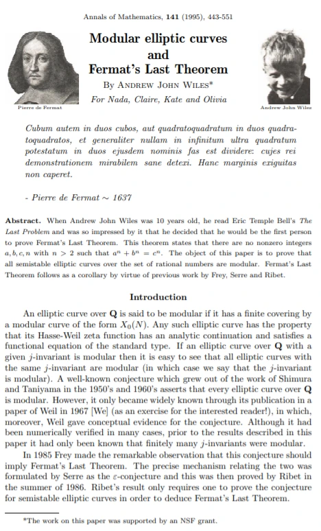 와일즈는 1995년 3월호 《수학연보》에 논문을 발표해서 드디어 358년 된 수학 난제인 <페르마의 마지막 정리>를 완벽하게 증명하였다. 그가 10살의 나이에 처음 <페르마의 마지막 정리>를 풀겠다는 꿈을 갖고 나서 30여 년 간의 노력이 결실을 맺게 된 것이다.