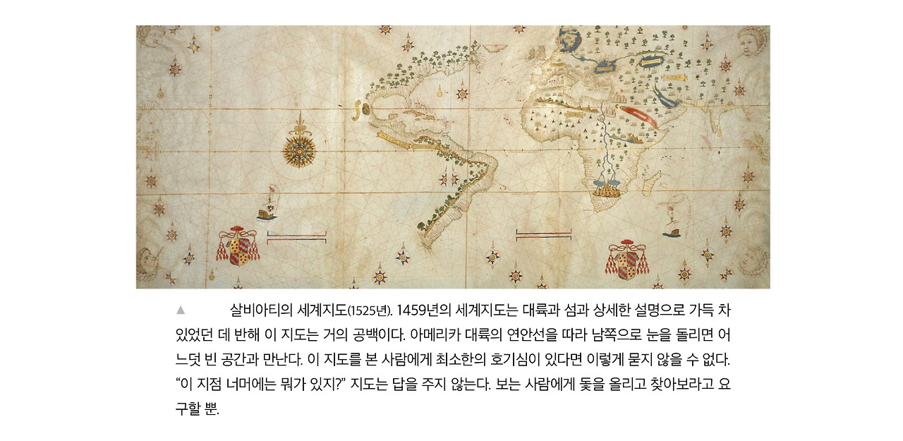 그런데 15~16세기에 유럽인들은 빈 공간이 많은 세계지도를 그리기 시작했다. 이것은 유럽인의 제국주의 욕구뿐 아니라 과학적 사고방식이 발전하기 시작했다는 것을 시사한다. 빈 지도는 심리적, 이데올로기적으로 비약적인 진전이었다. 유럽인들이 자신들이 세계의 많 은 부분에 대해 무지하다는 사실을 분명하게 인정했다는 점에서 그랬다.