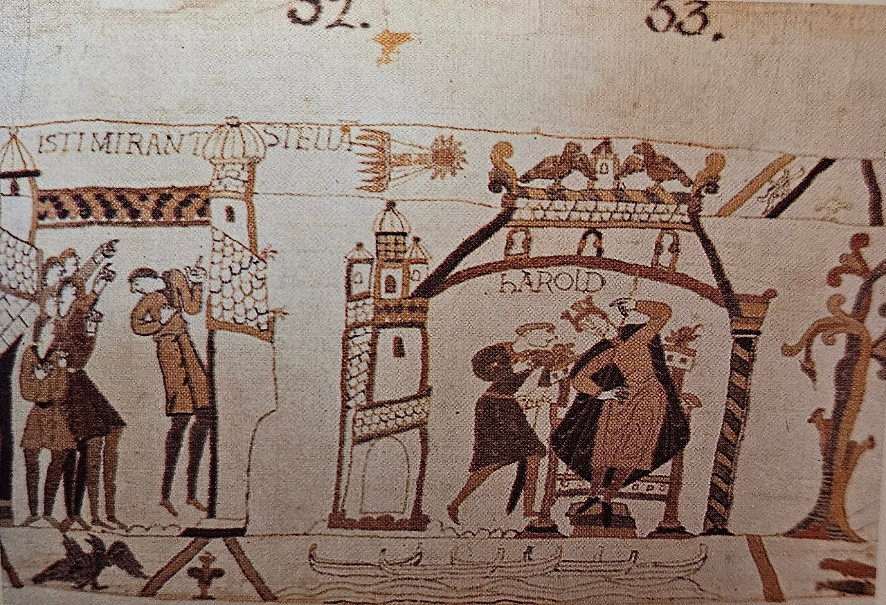 1066년 4월, 노르만인들의 ‘바이외 태피스트리’(Bayeux Tapestry)의 상세도에는 왼쪽에 “남자들이 혜성에 깜짝 놀라고 있다”라고 씌어 있고, 오른쪽에는 영국의 해롤드 왕에게 보고하는 그림이 나오는데 당시 정복왕 윌리엄의 승리를 묘사한 그림으로 보인다.
