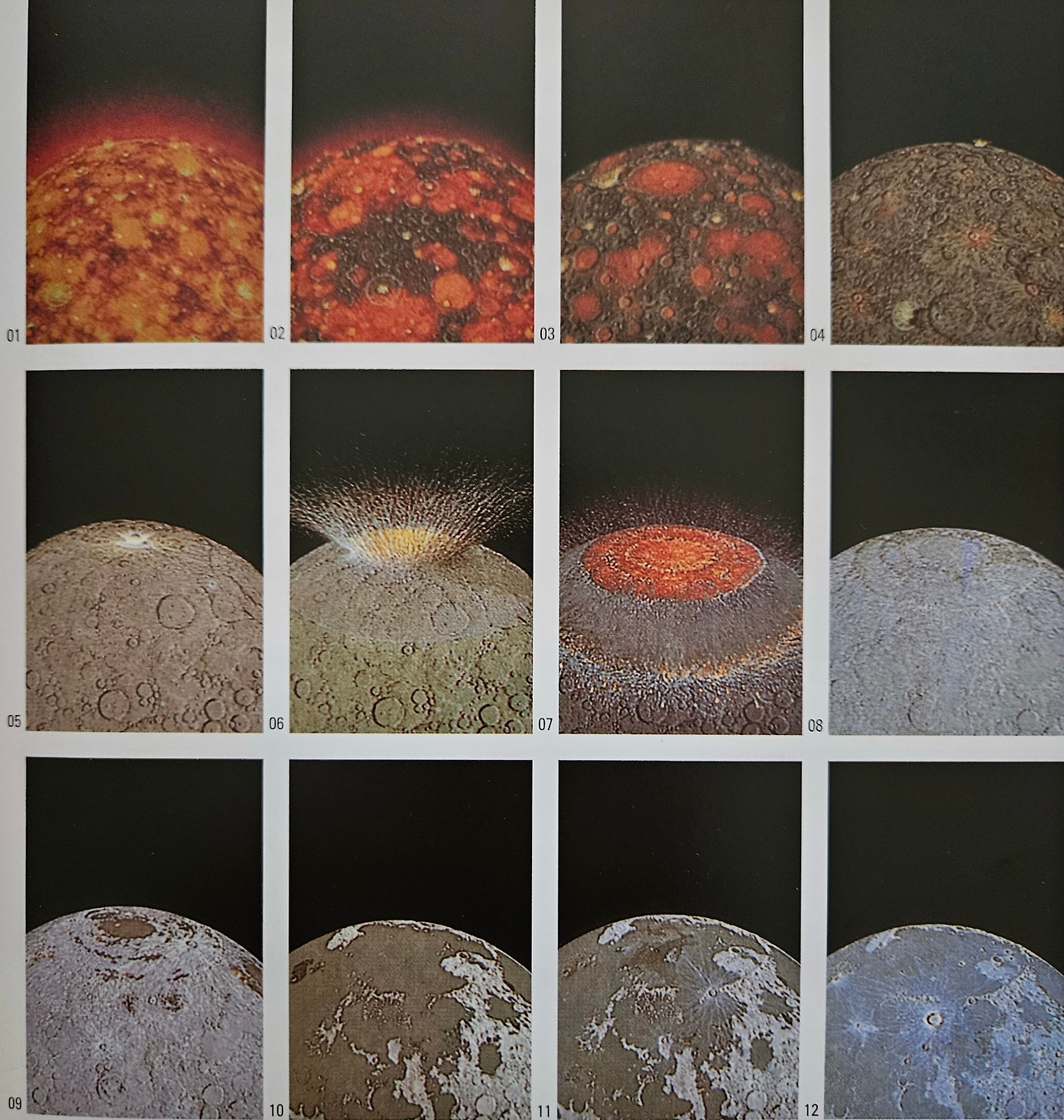 9~10은 약 27억 년 전 상황으로 지구 충돌의 결과로 만들어진 커다란 구덩이(‘비의 바다’ Mare Imbrium)가 현무암질의 용암으로 온통 뒤덮였다. 11의 에라토스테네스의 운석공이나 12의 코페르니쿠스의 운석공같이 광조 무늬가 뚜렷한 것들은 더 최근에 충돌의 결과로 생긴 운석공이다.