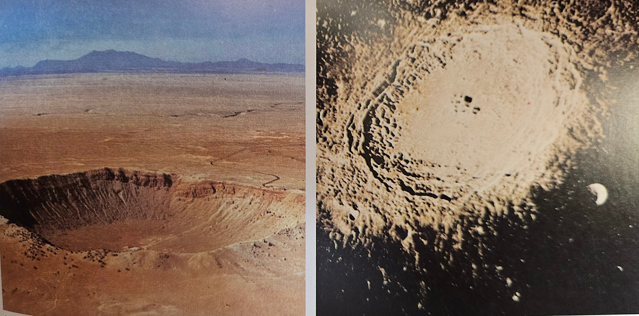 아래 사진들은 미국 애리조나 주에 있는 지름 1.2km의 운석공(좌, 약 15,000년에서 4만 년 사이로 추정)과 달의 적도 바로 북쪽에 있는 코페르니쿠스 운석공(우, 지름이 100km에 달한다)의 모습들이다.