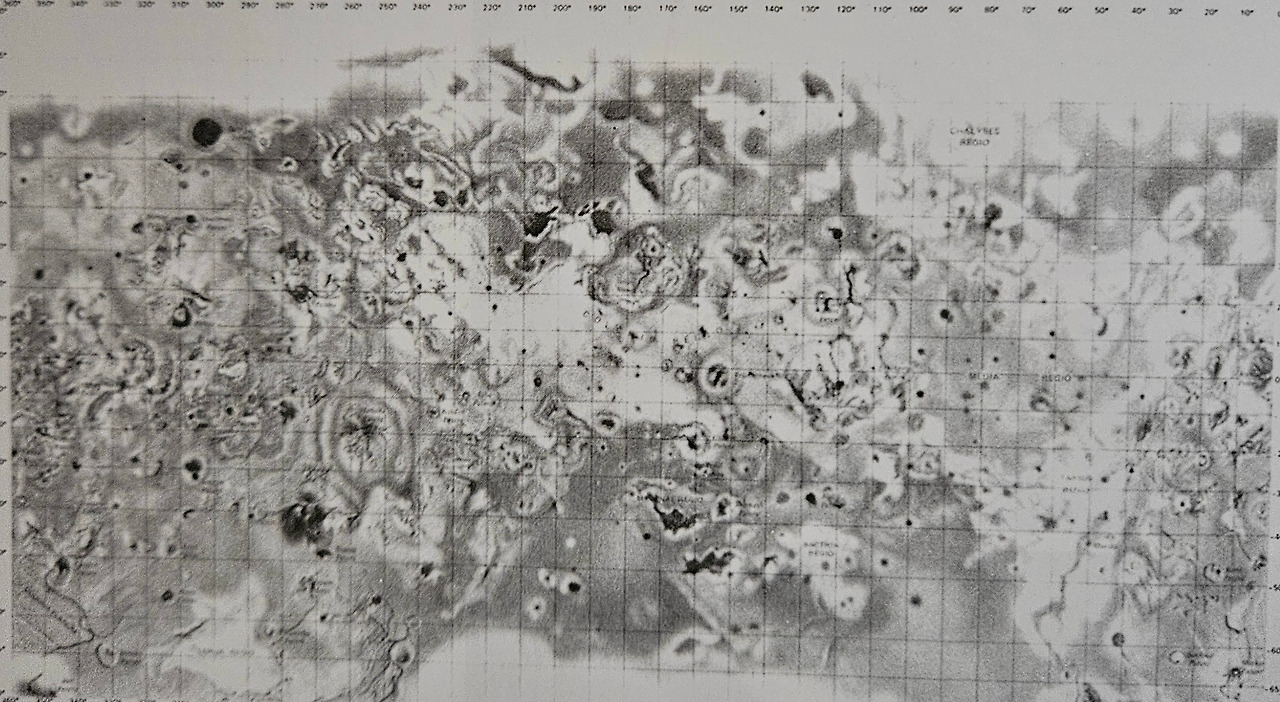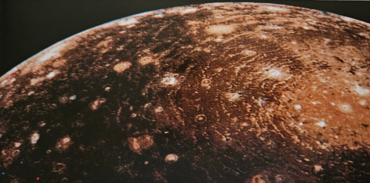 이 사진은 갈릴레오호가 1995년부터 2003년 사이에 목성궤도를 공전하는 중에 찍은 사진을 모자이크한 것이다. 얼음으로 이뤄진 평원과, 지평선 쪽으로 쭉 뻗어있는 균열, 얼음과 먼지로 인해 군데군데 어두운 부분들이 잘 보이고 있다. 융기지형은 그늘이 드리워지는 융기부의 말단부와 대비되어 특별히 도드라져 보인다.