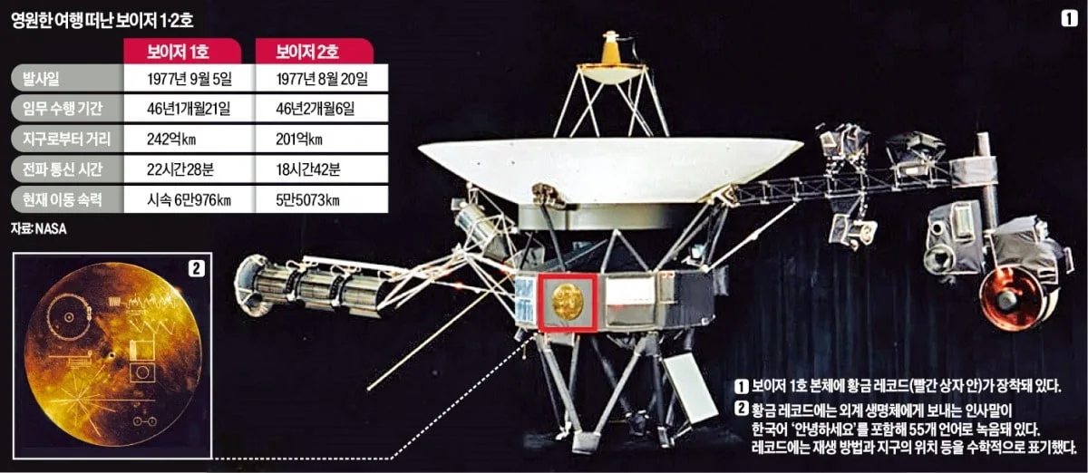 보이저호에는 외계인과의 조우를 염두에 두고 55개의 언어(한국어 “안녕하세요‘도 녹음되어 있다)로 녹음된 ‘황금 레코드’가 탑재되어 있는데, 재생방법과 지구의 위치 등을 수학적으로 표기해 놓았다.