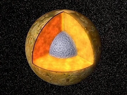 이오는 용융 상태의 철과 철 핵을 둘러싼 규산염 암석으로 이루어져 있고, 표면은 황과 이산화 황의 서리로 덮여 있다.