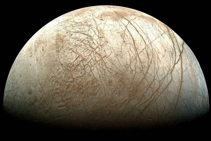유로파는 지구의 달과 거의 동일한 크기를 가지고 있지만 훨씬 매끄러운 표면을 가지고 있어서 고원이나 크레이터 자국은 거의 보이지 않는다. 갈릴레오로부터 수집된 증거와 사진들을 볼 때, 얼음 표면 밑에는 액체로 된 바다가 있을 것으로 추측된다.