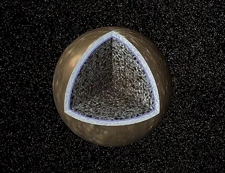 2015년 3월, 가니메데 얼음 아래에 지구보다 더 많은 물을 가진 소금 바다가 있다는 게 밝혀졌다. 2020년 주노 탐사선에 의해 가니메데의 북극에 비결정성(amorphous) 얼음의 존재를 확인했다. 수심이 약 97㎞로서 지구보다 10배가량 깊은 이 바다에는 1ℓ당 5g의 소금이 녹아 있는 것으로 추정된다.