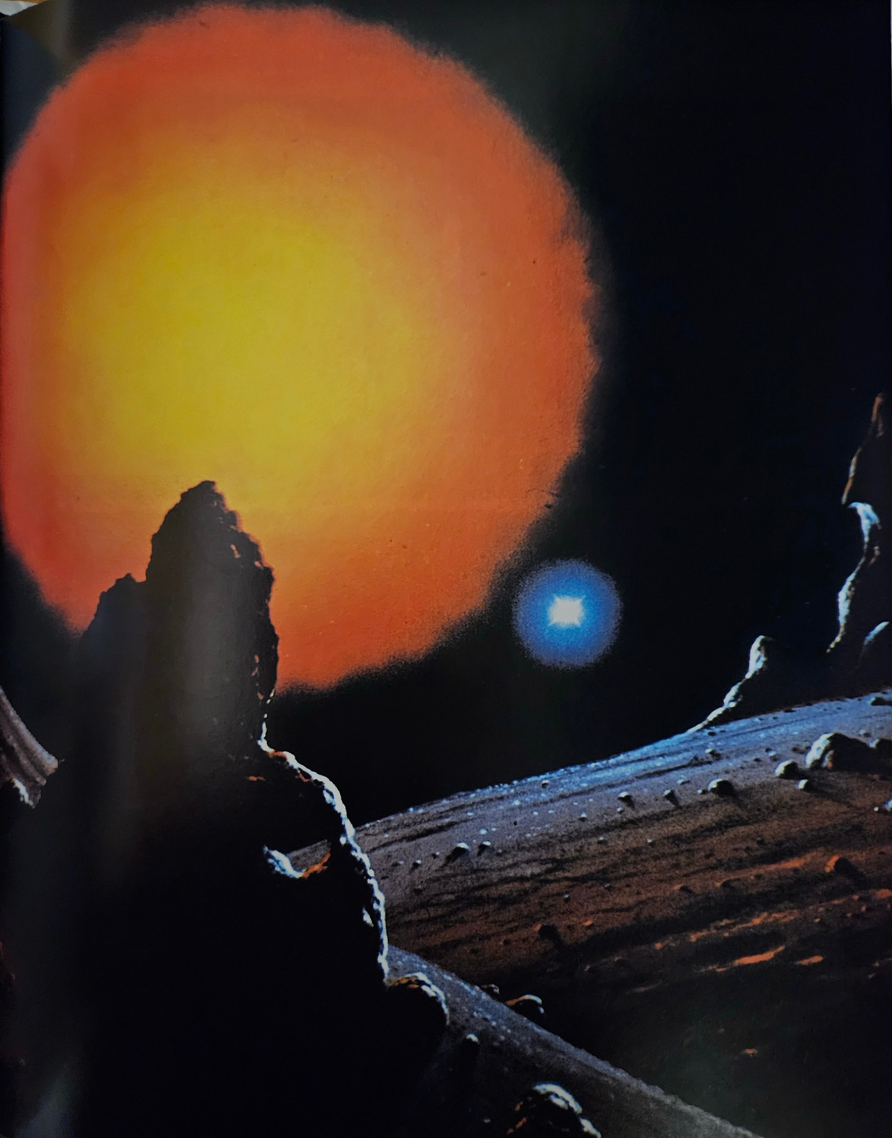 아래 그림은 어느 쌍성계가 거느린 대기가 없는 한 행성의 표면 모습의 상상도이다. 모든 물체들이 두 가지 색깔의 그림자를 표면에 드리우고 있는, 이는 쌍성계를 이루는 두 별의 색깔, 즉 표면온도가 서로 다르기 때문이다.