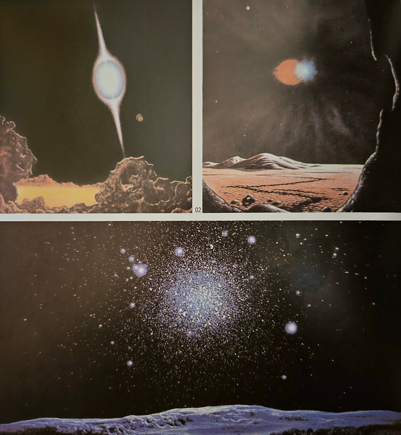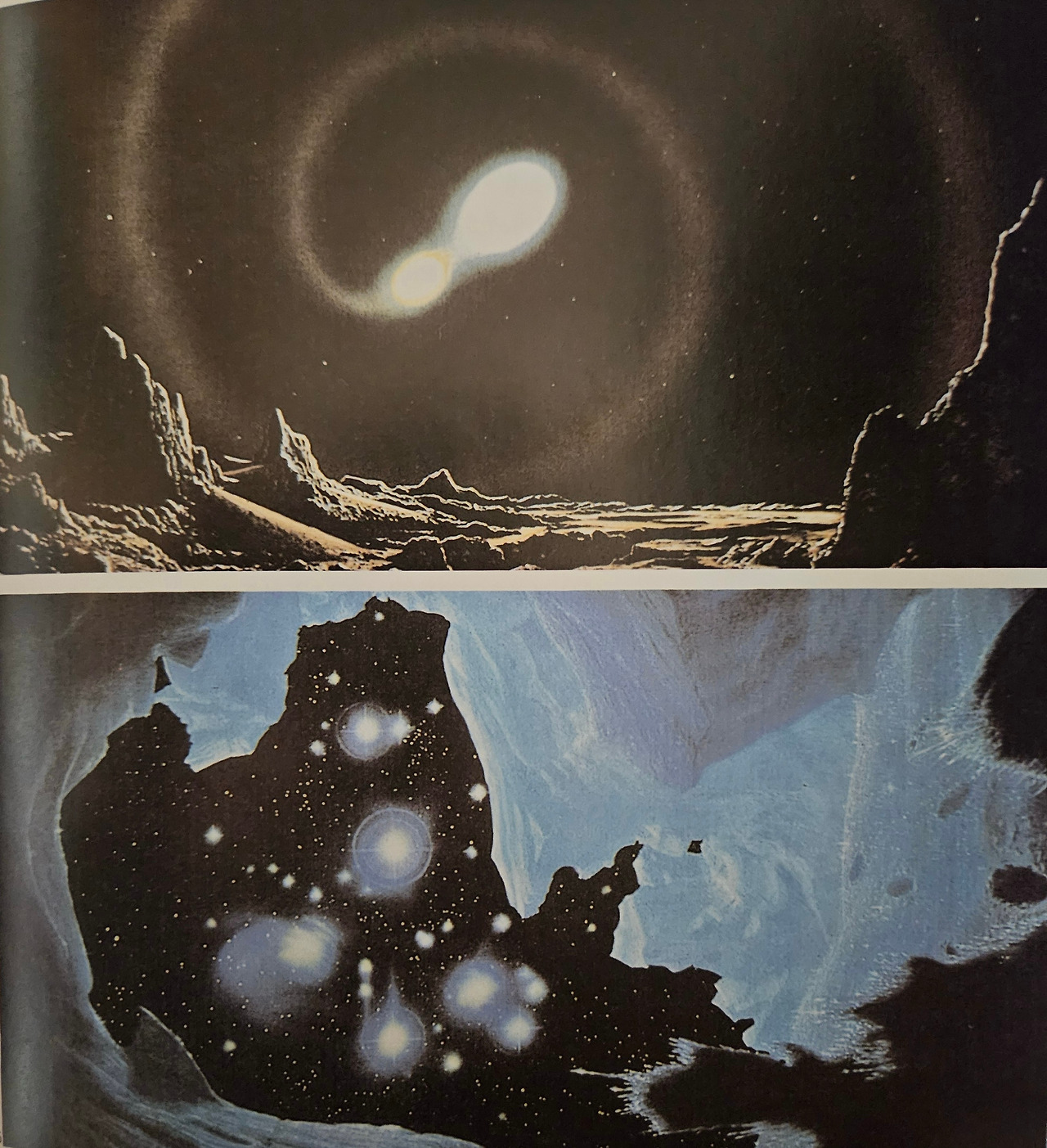 아래 그림 04는 접촉 쌍성계에 속한 가상 행성의 표면 풍경인데, 별들의 대기 물질이 쌍성 주위에 나선형의 거대한 궤도를 그리면서 우주 공간으로 빠져나가고 있다. 05는 한밤중에 가상 행성의 얼음 동굴에서 내다본 점생이성단의 원경이다.