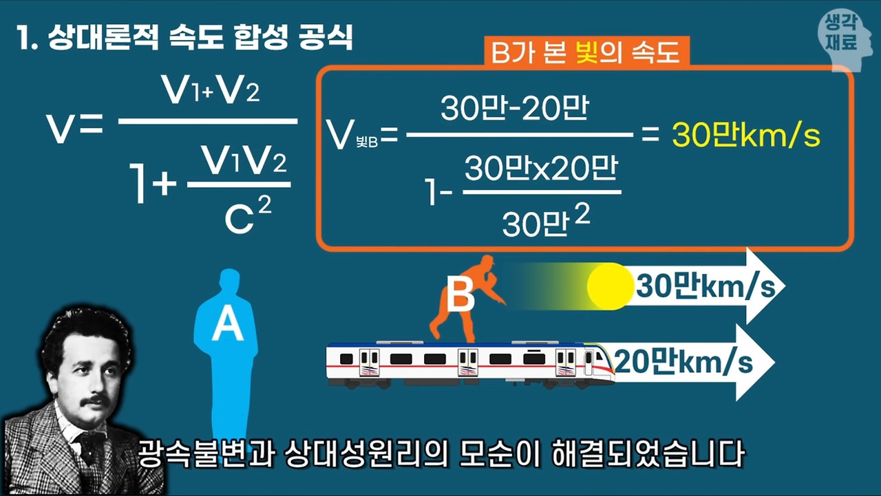 특수상대성 이론으로 인해 갈릴레이의 속도 합성 공식은 로렌츠 변환에 의해 대체되고 이로 인해 관점자에 따라 빛의 속도가 일정하다는 결론이 도출된다.