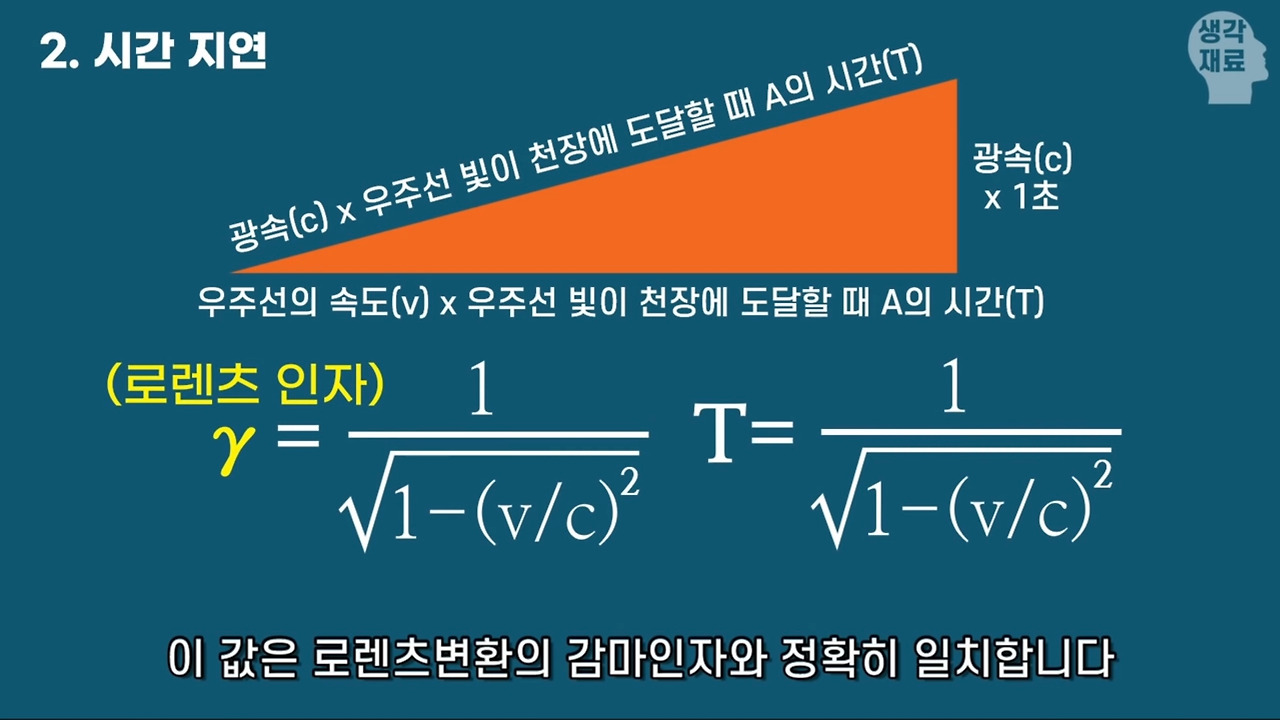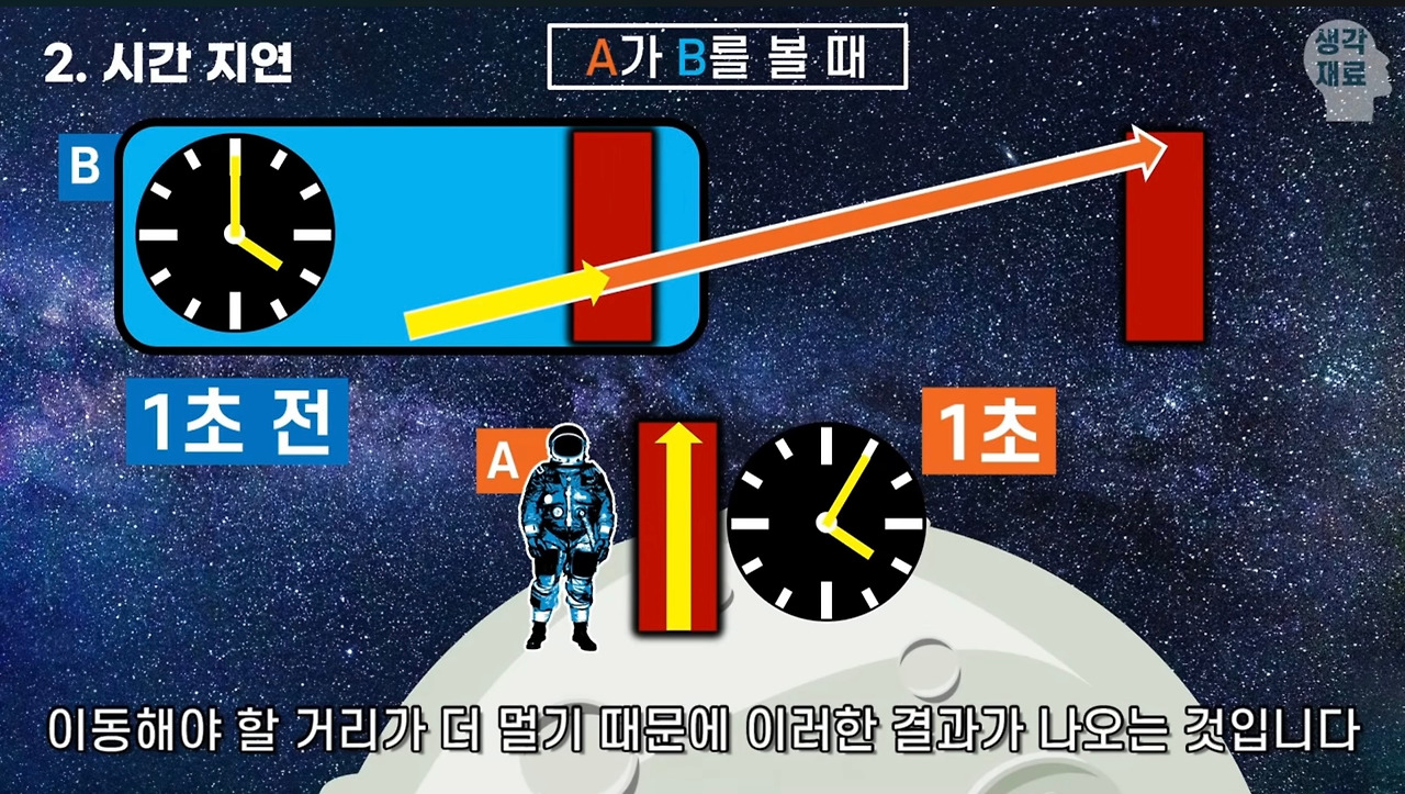 빛의 속도로 움직이는 우주선을 밖에서 볼 때 우주선의 시간은 느리게 흐르는 것처럼 보인다는 것이다. 즉 아래 그림처럼 밖에서 빛이 1초 동안 이동할 때 밖에서 바라보는 우주선 내의 빛은 아직 1초만큼 흐르지 않는다는 것이다.