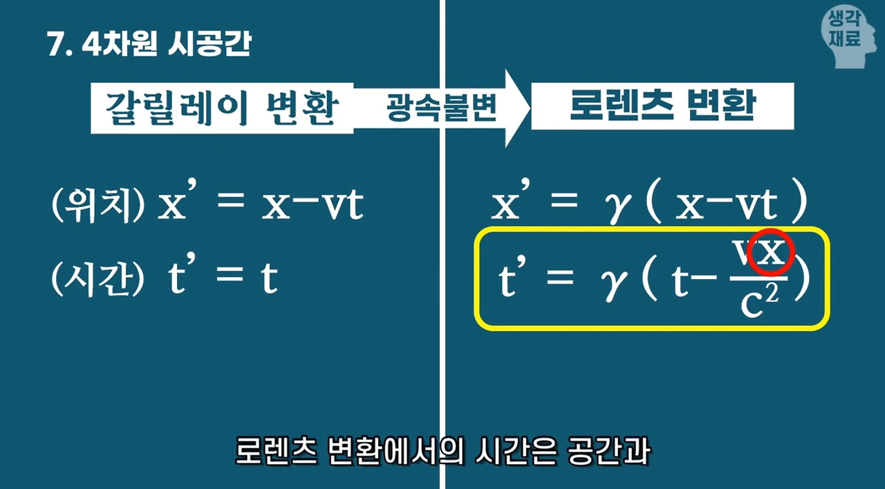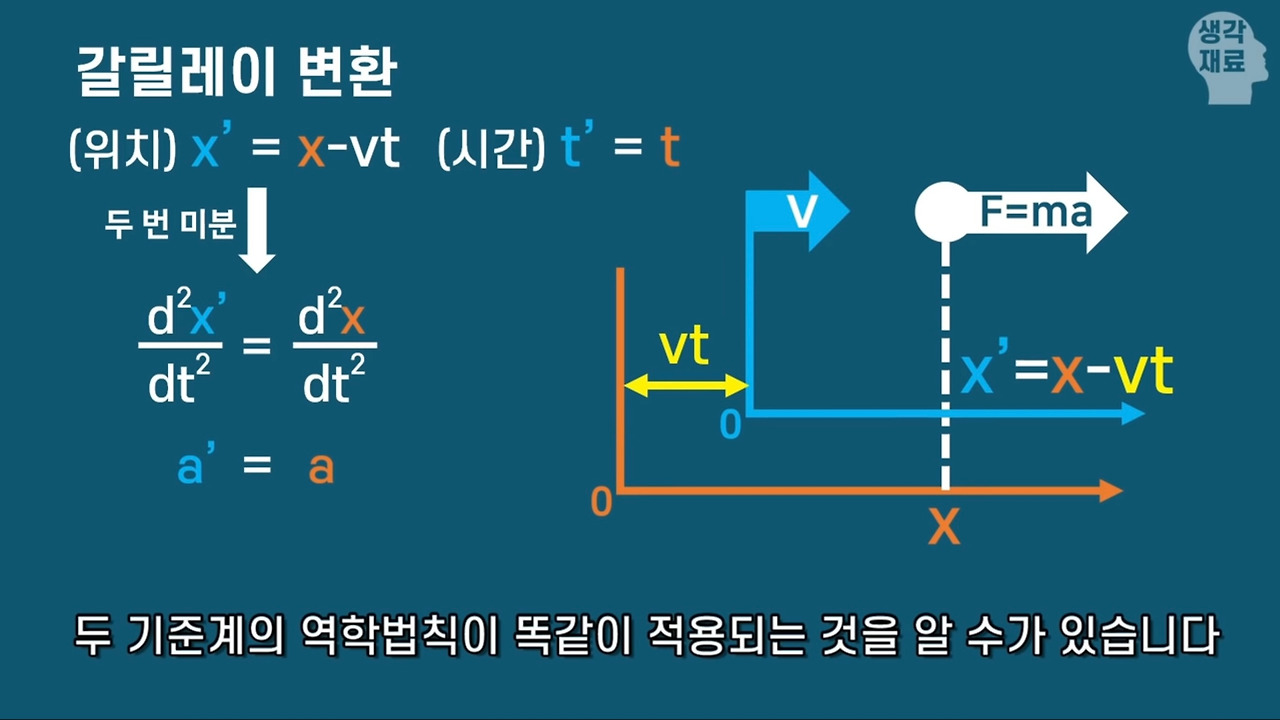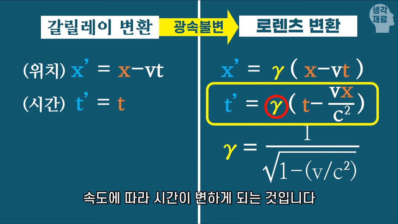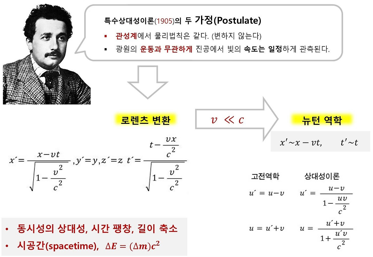특수 상대성 이론은 빛과 같은 고속의 물체에 대하여, 고전전자기학의 맥스웰 방정식에서처럼 모든 관성계에서 관찰자의 속도와 무관하게 빛의 속도는 일정하므로, 기존의 뉴턴 역학의 갈릴레이 변환을 ‘로렌츠 변환’*으로 대체한다.