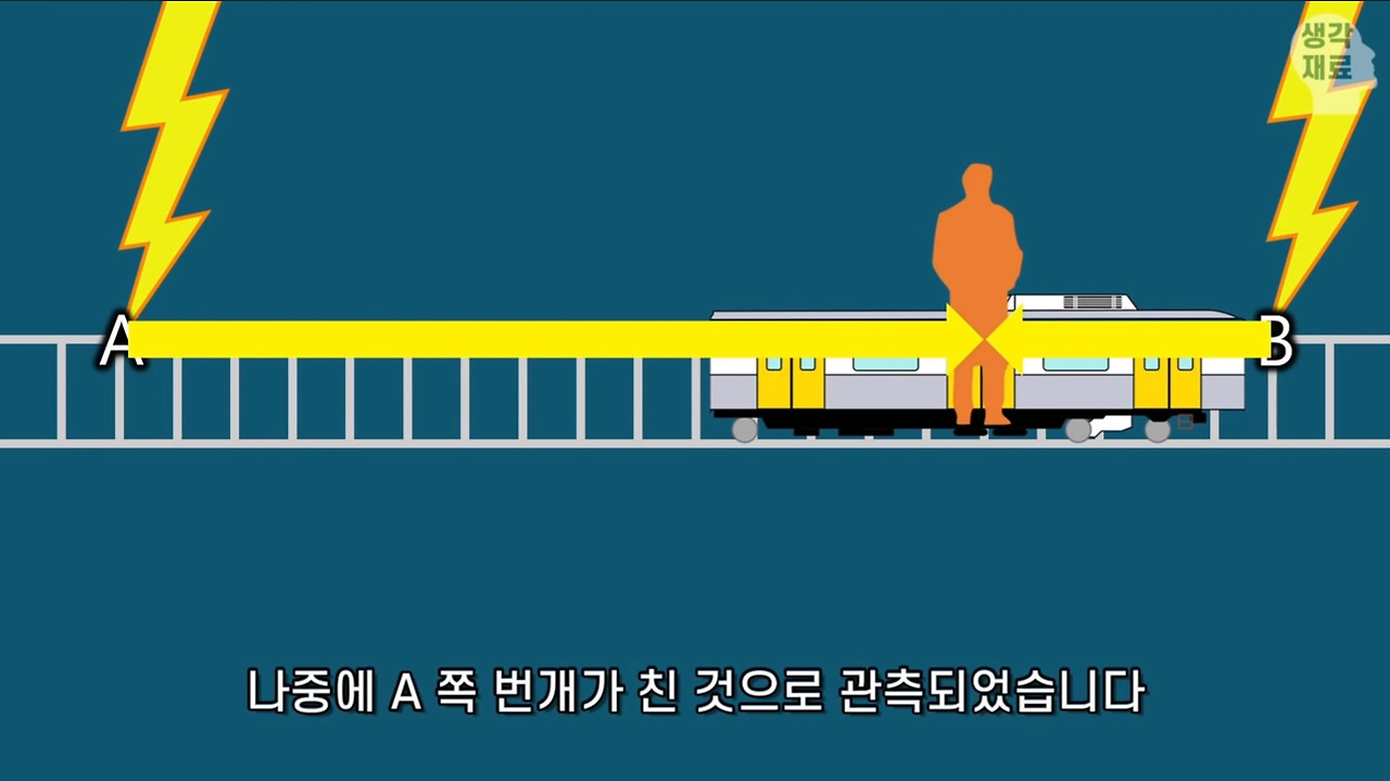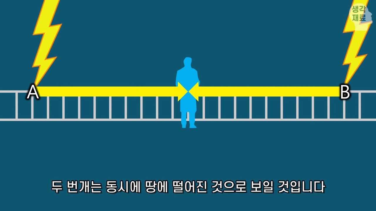 이는 정지해 있는 사람이 두 번개가 동시에 친 것처럼 느끼지만 움직이는 물체에 있는 사람은 그 방향 쪽의 번개가 먼저 친 것으로 인식하게 되는 실험을 통해서도 동시성의 불일치가 생기는 것을 확인할 수 있다.
