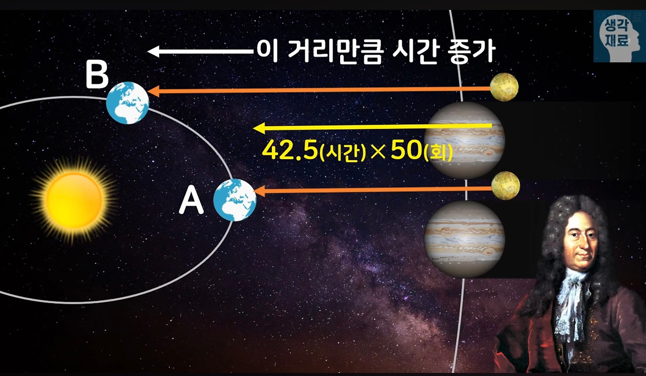 목성 주변에서 일정한 주기로 '이오의 식'은 일어나는데, 지구가 목성에 가까워질 때랑 멀어질 때 ‘이오의 식’이 끝나고 이오가 발견되는데 약 22분의 시간 차이가 있었다. 뢰머는 이 현상을 빛의 속도 때문이라고 생각했고 지구와 태양 사이의 거리를 계산해서 이를 통해 빛의 속도를 약 2억1200만m/s로 계산했다.