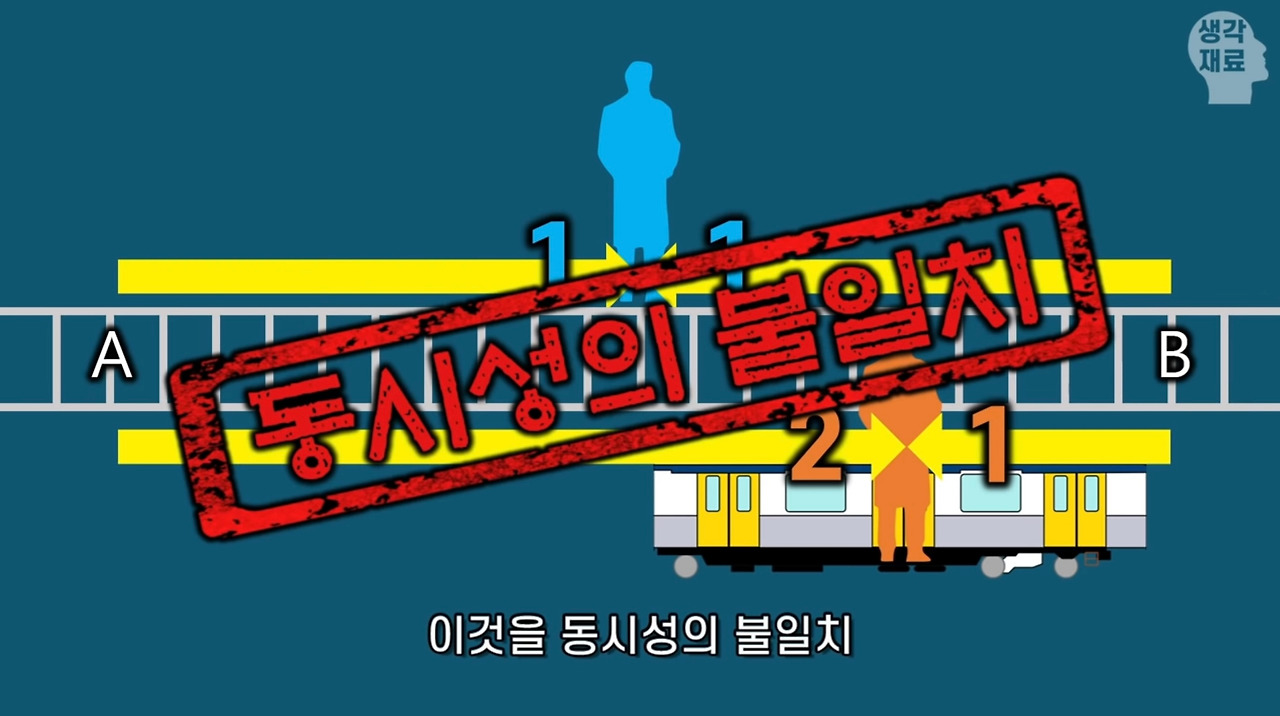또한 여기서 속도가 다른 두 물체에서 하나의 사건을 보더라도 실제 두 물체에서 그 사건을 본 시간은 같지 않다는 ‘동시성의 불일치’ 내지 ‘동시성의 상대성’ 현상도 발생하게 된다.