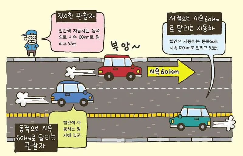 1) 어느 관성계(속도가 일정한 계)에서든 물리 법칙은 동등하게 적용된다.