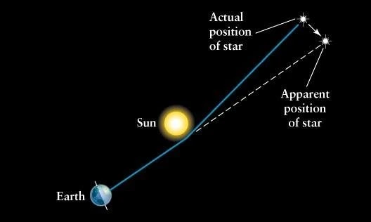 이는 1919년 5월 29일 영국의 천문학자 아서 에딩턴(Sir Arthur Stanley Eddington, 1882~1944)이 개기일식 중에 태양의 뒤에 있는 별(빛이 직진한다면 보이지 않아야 함)을 관측하고 그 실제 위치와의 차이를 아인슈타인의 이론으로 정확히 측정함으로써 증명되었다.