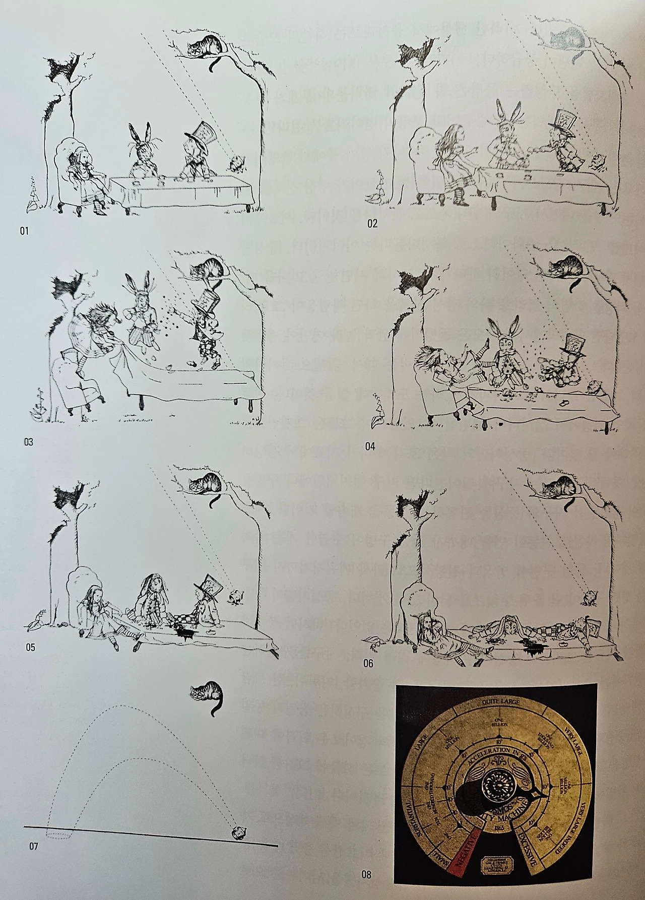 아래 그림은 《이상한 나라의 앨리스》에 등장하는 삼월 산토끼, 미치광이 모자 장수, 체셔 고양이가 앨리스와 함께 차를 마시는 상황에서 지구의 중력이 변함에 따라 변하는 모습을 그린 것이다. 01은 정상 상태, 02~04은 중력이 약해졌다가 정상으로 돌아오는 상황, 05~06는 중력이 강해져서 바닥에 움짝달싹할 수 없게 되는 상황이고 07은 마지막으로 중력이 너무 커져 빛마저 휘는 상황을 묘사한다.