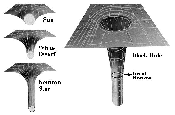 아인슈타인의 일반 상대성 이론에 따른 공간의 곡률을 생각해 보면, 특정 부위에 있는 질량이 크면 클수록 그 주변 공간도 더 심하게 변형될 것이다. 아인슈타인의 비유에 의하면 ‘블랙홀은 공간에 패인 바닥 없는 보조개’라고 주장할 수 있다.