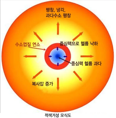 태양은 이 단계에서 중앙에서 멀리 떨어져 상대적으로 저온 상태에 있는 외부의 얇은 껍질에서는 수소가 타고 고온 상태에 있는 한복판에서는 헬륨이 연소 중이라서 외부는 급격히 팽창하고 대신 온도는 하강함으로써 적색거성이 된다.