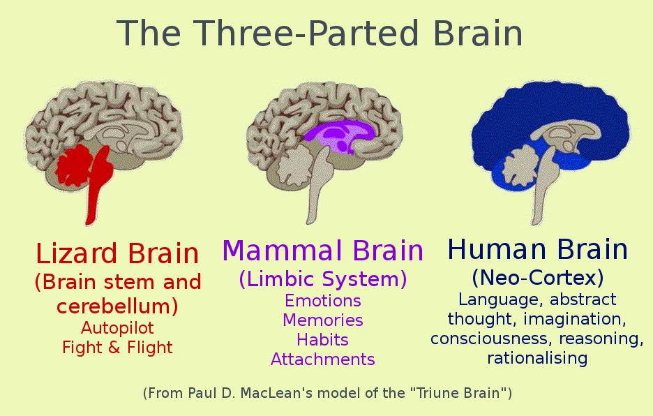 우선 뇌는 내부에서 외부로 진화했고, 가장 깊숙한 곳에 뇌간이 자리하고 있다. 뇌간은 반사작용, 심장 박동, 내장활동, 호흡 등 생명의 가장 기본적인 기능을 조절합니다. 폴 맥린(Paul MacLean)에 따르면 뇌의 고차원적인 기능들이 크게 세 단계에 걸쳐 진화했다고 한다.