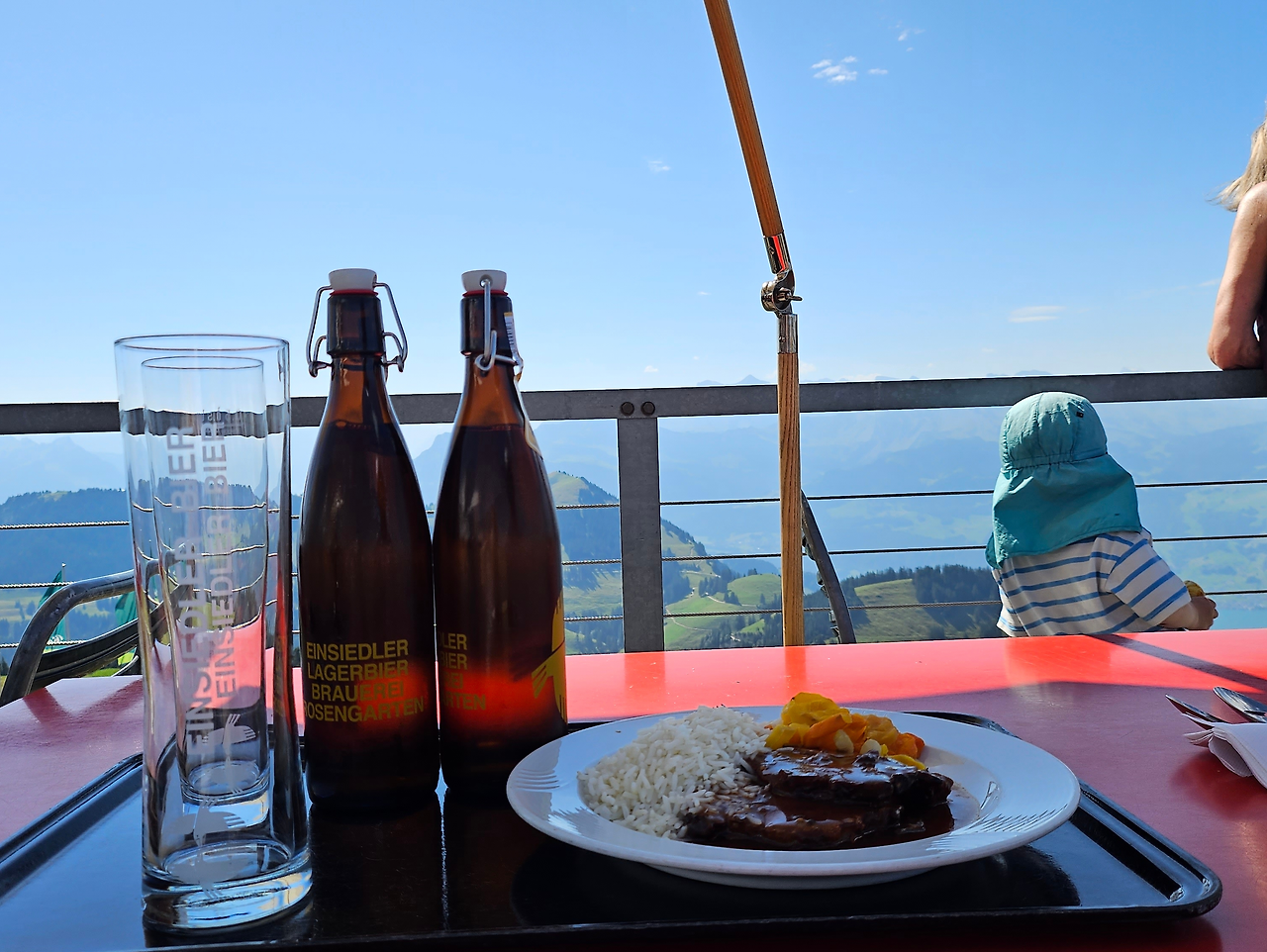 배에서 내려서 푸니쿨라를 타고 한참을 올라 1,798미터의 리기산 정상에 다다르면, 주변 산들에 둘러 쌓인 루체른호수와 추크호수가 한눈에 내려다 보이는 멋진 광경이 펼쳐진다. 리기산 정상 휴게실에서 마시는 스위스 맥주와 돼지고기 스테이크의 추억도 잊을 수가 없다^^