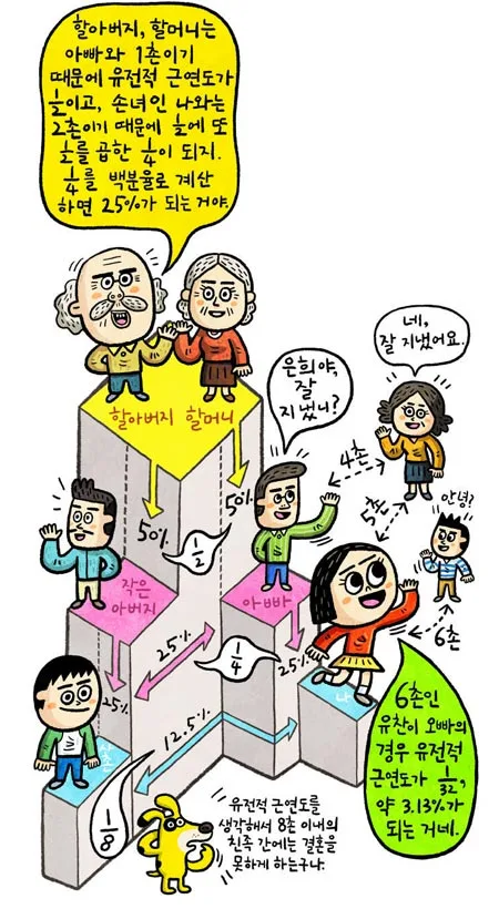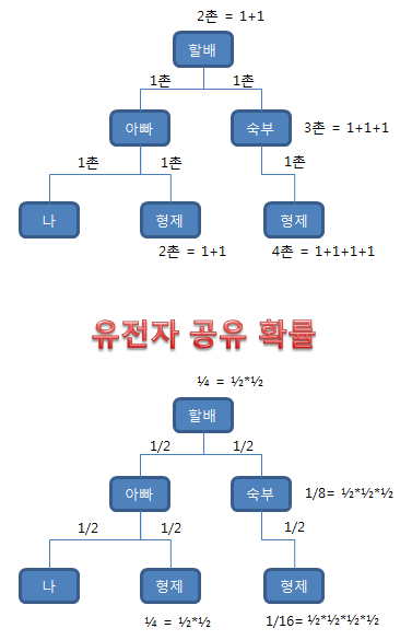근연도 = 공동조상수(직계는 한 명, 방계는 2명) x (1/2)^세대간격(공동조상까지 올라갔다가 내려오는 간격)