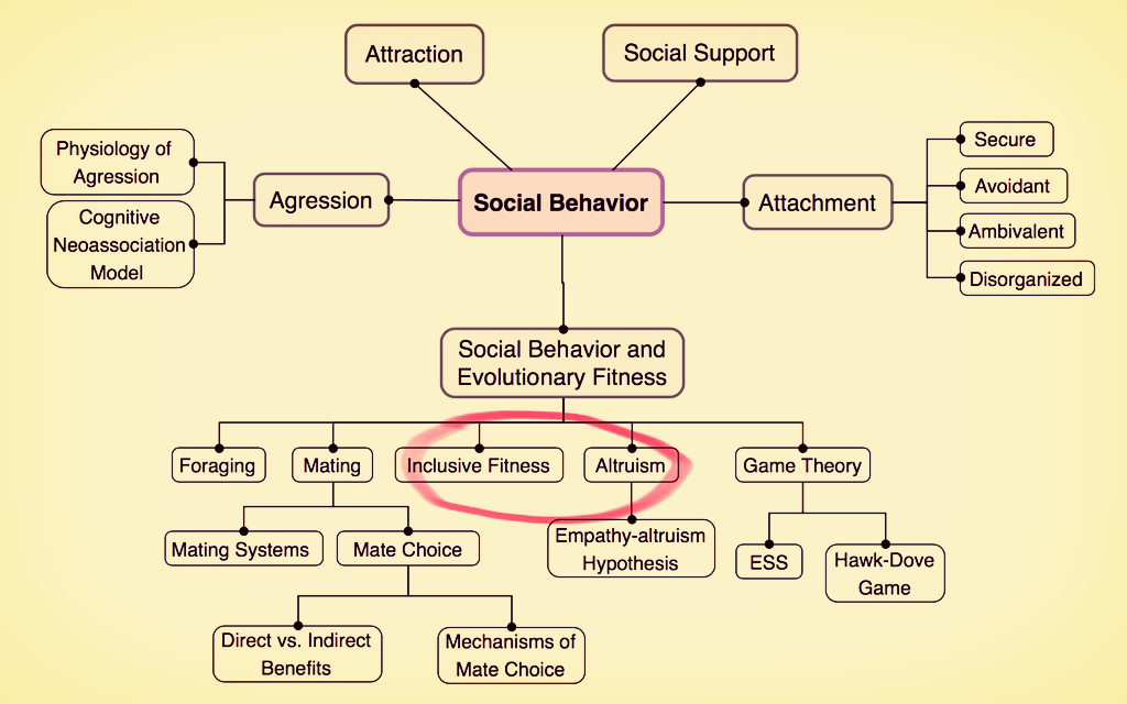 해밀턴 법칙은 유전자 계통과 사회행동(Social behavior)의 진화에서 그 한 축을 이루는 친족 선택(Kin selection)의 축에 의해 이타주의가 설정될 수 있다는 전제를 이해할 수 있게 해주는 이론이다. 해밀턴 법칙은 포괄 적합도* = 직접 적합도 + 간접 적합도로 추정한다. 직접 적합도는 자신이 직접 번식하는 적합도이고 간접 적합도는 자신이 직접적합도를 포기하고 근친도가 높은 형제자매들의 번식을 돕는 것이다.