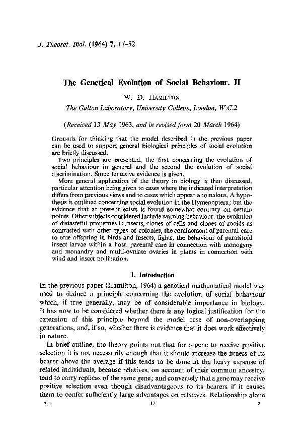 해밀턴의 1964년 논문 “The Genetical Evolution of Social Behaviour I and II”은 사회성 동물 행동학 문헌 중 가장 중요한 것인데, 우리가 계산하려는 것은, 예컨대 자매와 같은 두 개체가 특정한 유전자를 공유할 확률이다.