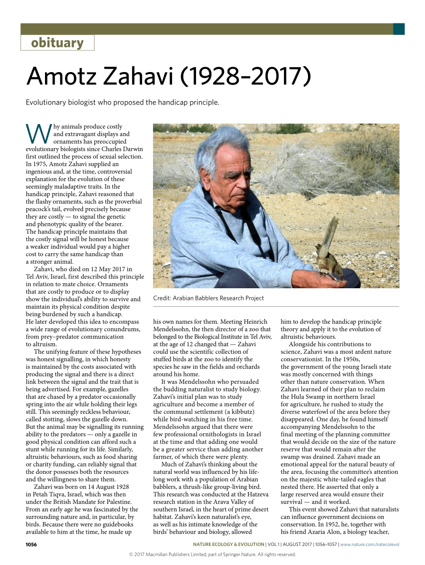 자하비는 다윈의 '성 선택(sexual selecton)' 이론에 대해 불신하며 그 대신 '핸디캡 원리(handicap principle)'라는 정반대의 설명을 제안한다. 자하비는 풍조와 공작새의 꼬리, 사슴의 거대한 뿔 등 성적으로 선택된 형질은 그 소유자에게 핸디캡이 되는 듯 보이는데, 이들 형질이 바로 핸디캡이기 때문에 진화됐다고 주장한다. 즉 그런 핸디캡에도 불구하고 아직도 살아남을 정도로 완강하고 남성다운 수컷이라고 암컷에게 선전한다는 것이다.