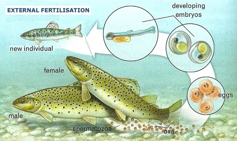 어류 대부분은 교미를 하지 않고 생식 세포를 그냥 물속에 방출한다(유성생식이 처음 출현했을 때에도 아마 비슷했을 것으로 추정된다). 수컷이 암컷의 체내에 정자를 주입하지 않기 때문에 암컷이 자식을 품은 채 혼자 남을 필요가 없다.