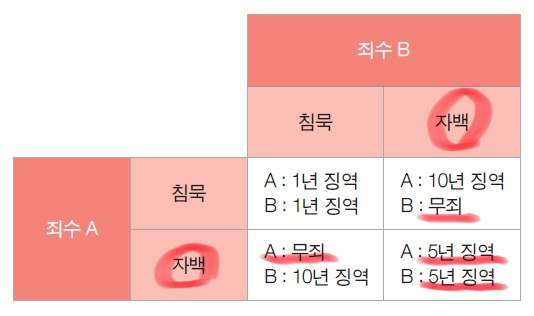 양쪽이 모두 부인하면 증거가 충분한 건에 대해서만 약한 형량을 받고, 한쪽이 자백하고 다른 쪽이 부인하면 부인한 쪽은 가중 처벌되며, 모두 자백하면 두 건 모두 처벌을 받지만 둘 다 감경된 형을 받게 되는 상황이다.