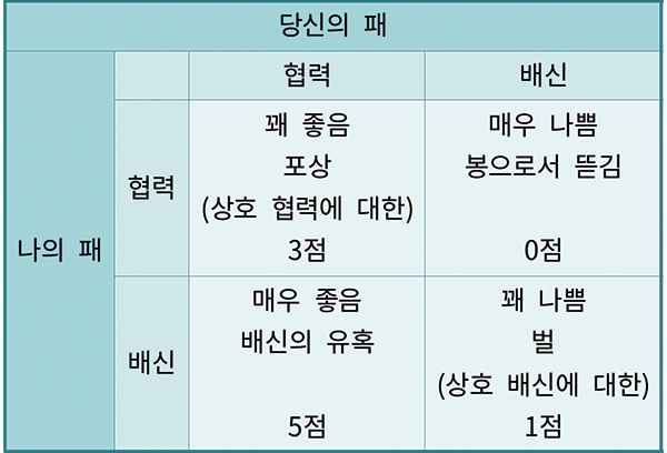 * 이 게임이 작동하기 위해서는, 1) 배신의 유혹은 상호 협력에 대한 포상보다 커야 하고(500 > 300), 2) 상호 협력에 대한 포상은 상호 배신의 벌보다 커야 하며(300 > -10), 3) 상호 배신의 벌은 봉이 뜯기는 양보다 나은 것이어야 한다(-10 > -100). 또한 4) 배신의 유혹과 봉이 뜯기는 양의 평균이 포상을 초과해서는 안 된다(500 + -100 /2 < 300).