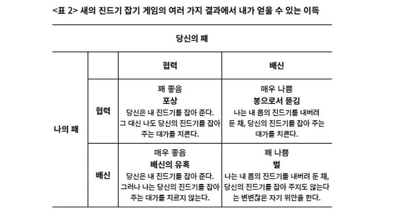 이것을 생각하면 할수록 인간의 생활뿐만 아니라 동물과 식물, 심지어 박테리아까지도 모두 반복된 죄수의 딜레마 게임을 하고 있다는 사실을 알게 될 것이다. 여기서 반복이 왜 중요한가에 대해 더 자세히 검토를 해보자.
