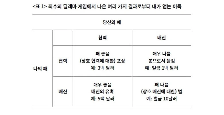 결과 3 : 당신이 ‘협력’ 카드를, 내가 ‘배신’ 카드를 냈을 때 물주는 나에게 5백 달러를 지불하고(‘배신의 유혹’) 당신(봉)에게 벌금 1백 달러를 징수한다.
